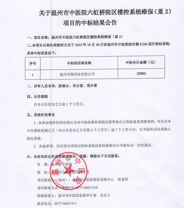关于51吃瓜网 六虹桥院区楼控系统维保(重2)项目的中标(成交)结果公告