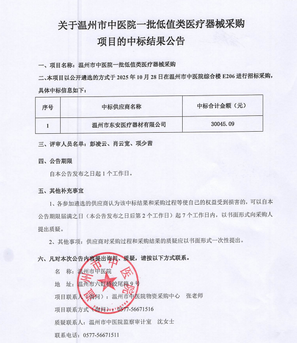 关于51吃瓜网 一批低值类医疗器械采购项目的中标(成交)结果公告