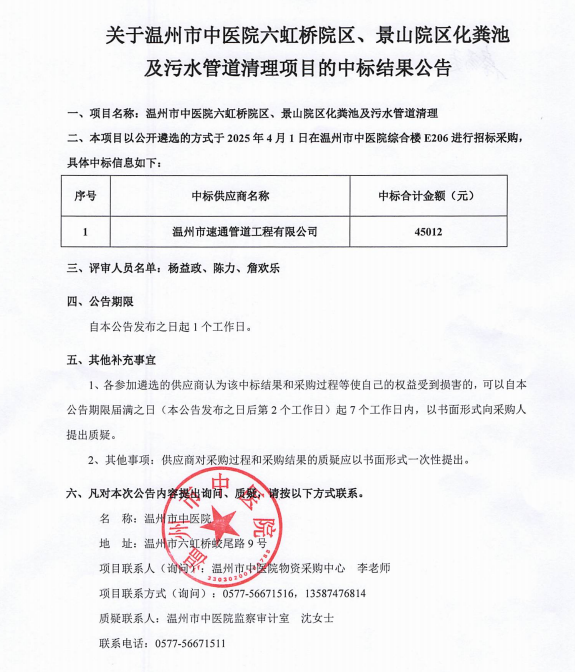 关于51吃瓜网 六虹桥院区、景山院区化粪池及污水管道清理项目的中标(成交)结果公告