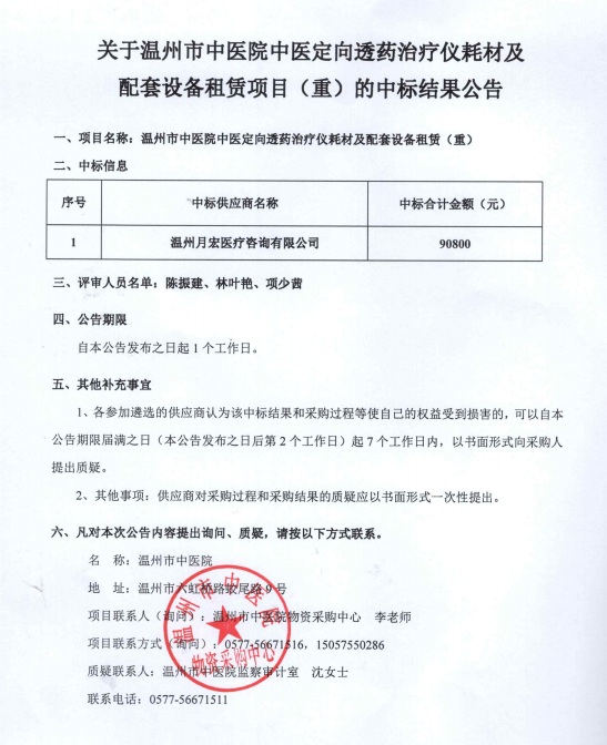 关于51吃瓜网 中医定向透药治疗仪耗材及配套设备租赁项目的中标(成交)结果公告