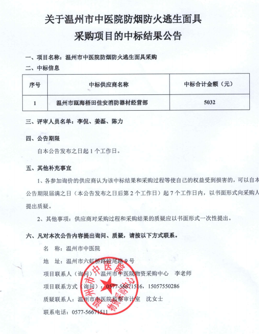 关于51吃瓜网 防烟防火逃生面具采购项目的中标(成交)结果公告51吃瓜网详情 +