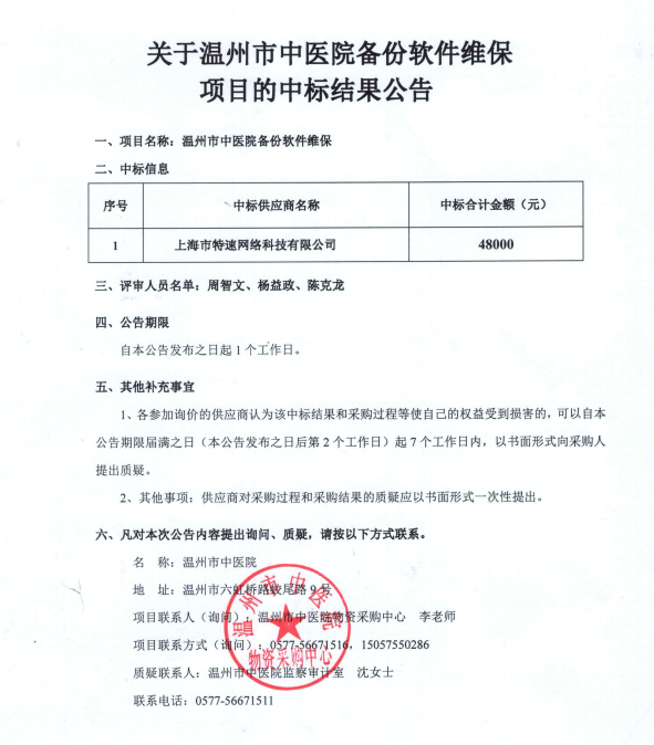 关于51吃瓜网 备份软件维保项目的中标(成交)结果公告