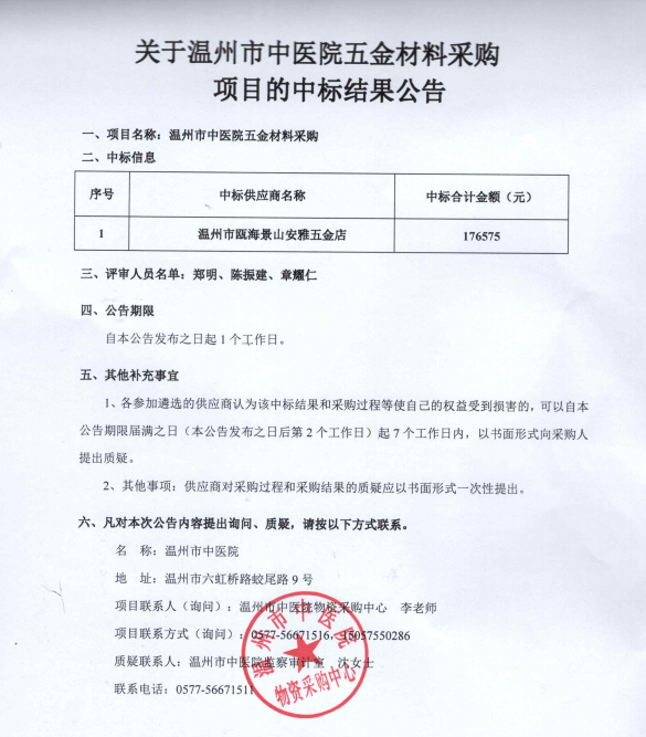 关于51吃瓜网 五金材料采购项目(重)的中标(成交)结果公告51吃瓜网详情 +