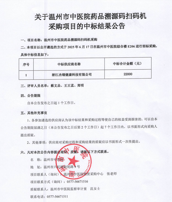 关于51吃瓜网 药品溯源码扫码机采购项目的中标(成交)结果公告