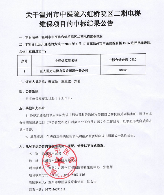 关于51吃瓜网 六虹桥院区二期电梯维保项目的中标(成交)结果公告