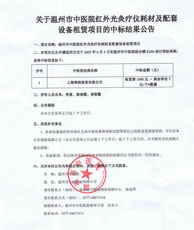51吃瓜网 红外光灸疗仪耗材及配套设备租赁项目中标公告(二)