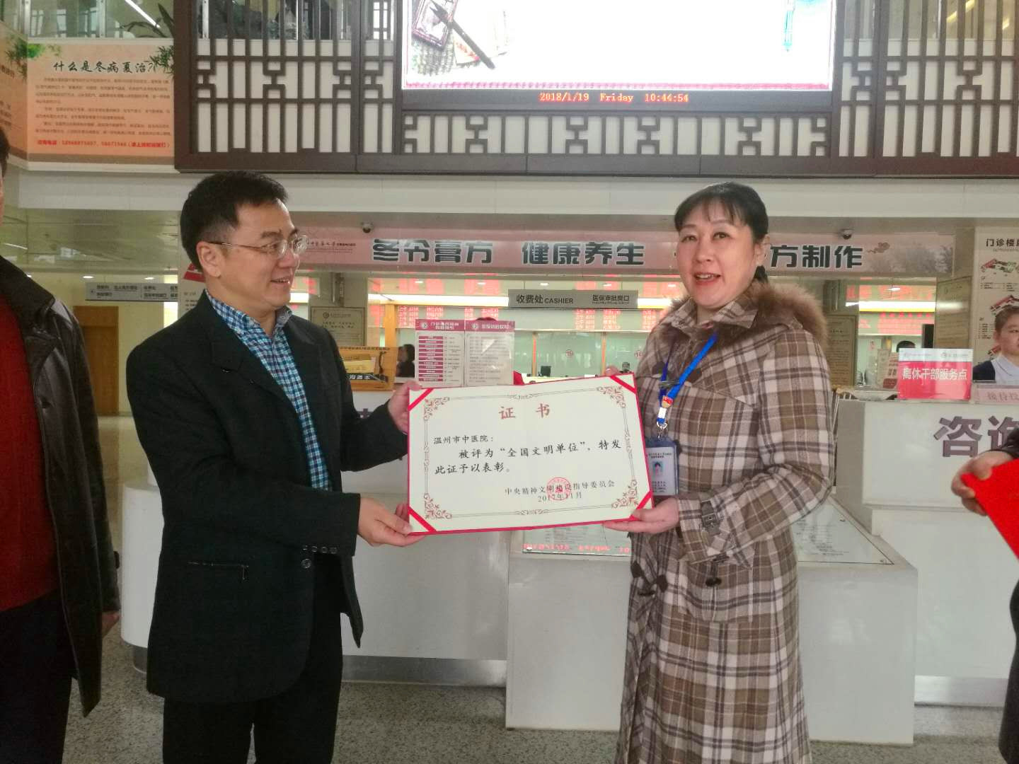 市文明办主任吕朝晖一行来院送荣誉1月19日上午,温州市委宣传部副部长、市文明办主任吕朝晖、副主任丁柏强、处长翁曙明一行专程送“全国文明单位”荣誉牌、证书到51吃瓜网 六虹桥院区。党委副书记黄爱林代表医院接过“全…51吃瓜网详情 +