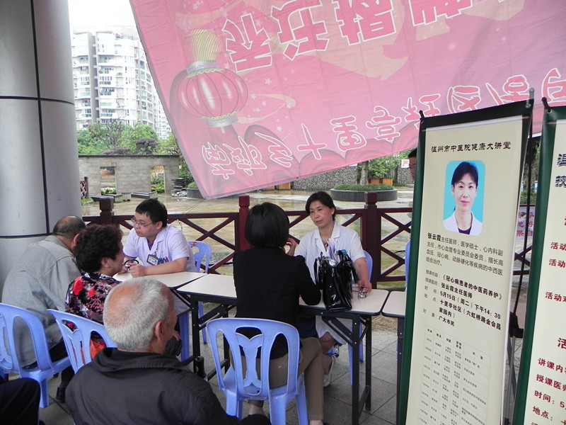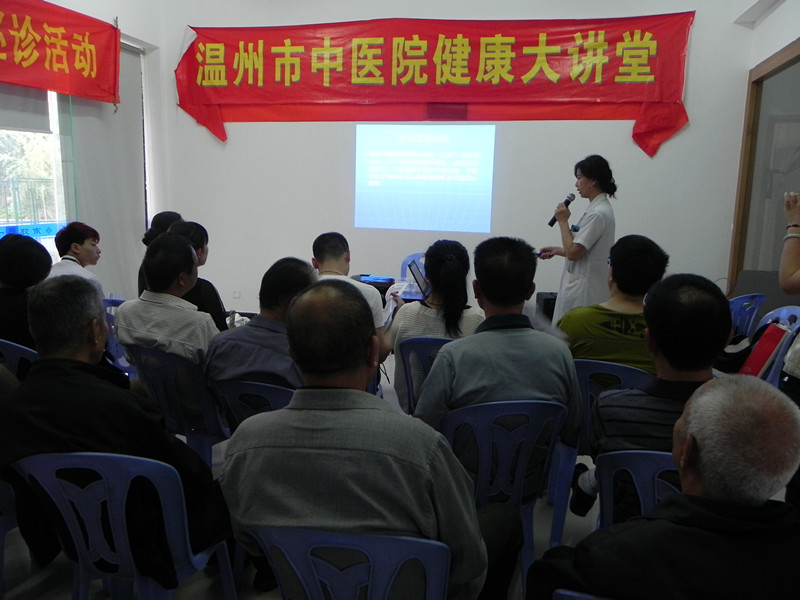 5月15日下午,我院“中医药适宜技术进社区活动”第三站来到金会昌家园十里亭社区。我院第四期健康大讲堂讲座在十里亭社区活动室举行。讲座之前,护理部卢韵琦副主任先教大家做耳穴操,现场气氛十分活跃。心内科张云霞主任作题为《冠心病患者的中医药养护》的讲座。张云霞医生从冠心病的病因、危险因素、临床表现、诊断冠心病需做的检查及冠心病治疗方法等方面进行讲解;重点讲解了冠心病的中医研究进展、如何辩证论治及中医药养护等内容,强调防病养生应顺应春生、夏长、秋收、冬藏的自然界规律,还应调摄饮食、调节情志和注重动静结合。