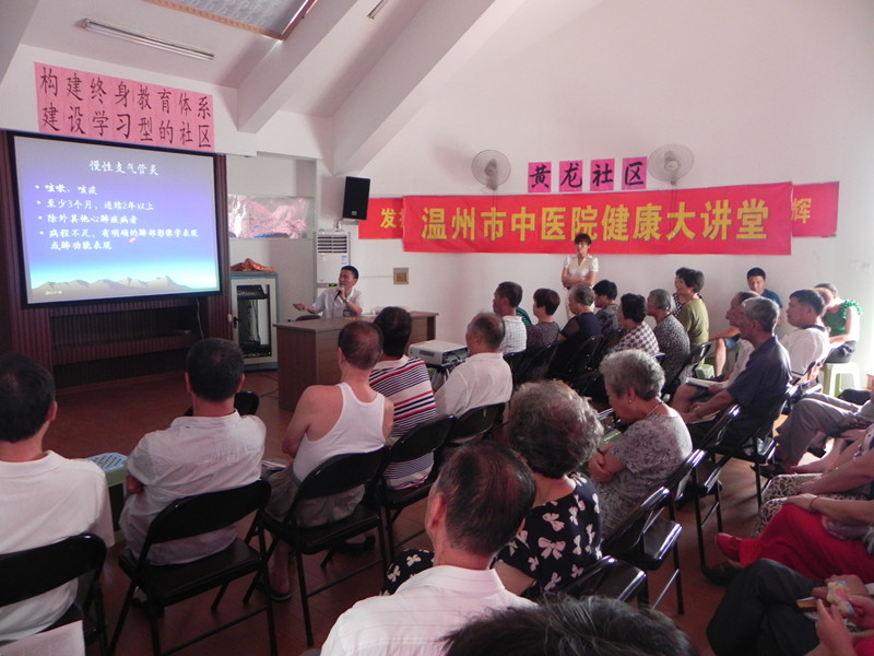 同时,我院今年第七期健康大讲堂讲座在黄龙康园住宅区活动中心会议室举行。首先,由我院景山康复中心护士长伊仙琼教大家做经络拍打操,与前来听课的居民进行现场互动。随后,呼吸科主任、主任中医师刘刚作了题为《慢性阻塞性肺病的预防和康复》的讲座。刘刚医生从慢性阻塞性肺疾病的定义、危险因素与诊断方法、康复治疗的内容以及如何在三伏天进行冬病夏治预防疾病等方面进行讲解,重点讲解慢性阻塞性肺疾病的康复治疗,强调注重患者教育、戒烟是自我管理的第一步、预防感冒的措施以及进行呼吸康复的重要内容,让前来听课的居民们受益匪浅。