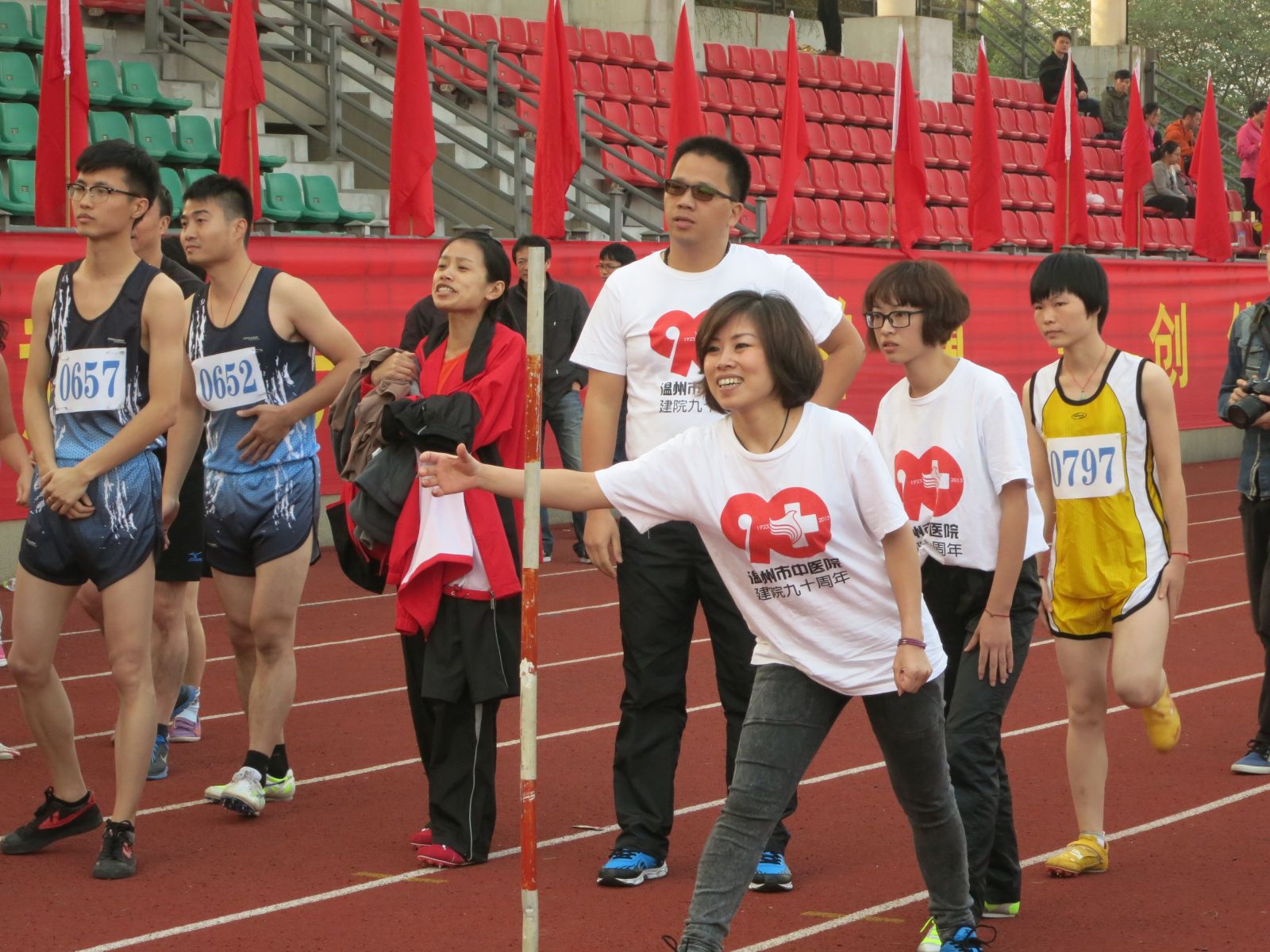 为进一步推动全民健身活动的深入开展,促进与浙江中医药大学及各附属医院的交流和合作,着力提升医院职工的集体凝聚力。2013年11月13日下午,我院工会组成39人的代表队,在党委副书记黄爱林同志的带领下,赴杭州参加14日至15日为期两天的浙江中医药大学2013田径运动会暨教职工健身运动会。在田径运动会中:医院代表队获集体“体育道德风尚奖”;徐玉燕同志获女子老年组800米第一名,并荣获运动员“体育道德风尚奖”;郭跃丽同志获女子中年组800米第三名;刘秀祥同志获男子中年组100米第六名。在健身运动会中:医院代表队获团体总分第二名,其中在拔河比赛和仙人指路项目上均获得第一名。