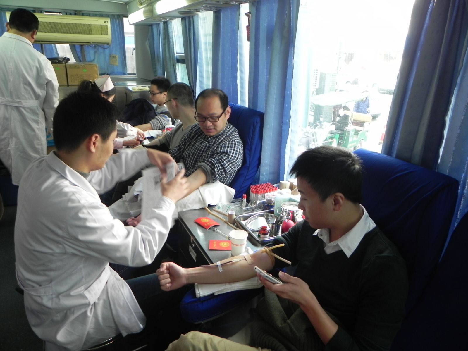 我院麻瑞龙副院长这次已经是第16次参加无偿献血了。他表示,健康人适量献血对身体不会造成任何影响。此外,作为一名医务人员,在临床抢救中经常遇到因为缺血而导致患者延误治疗的情况,因此他呼吁全社会的健康人都加入到无偿献血的队伍中来,为抢救生命贡献一份力量。景山康复部吴红专主任带头献血,全科医生出动,他们表示:无偿献血是一件利人利己的事,适当的献血不仅对个人身体有益,而且自己付出一点点,却可能挽救他人的生命。