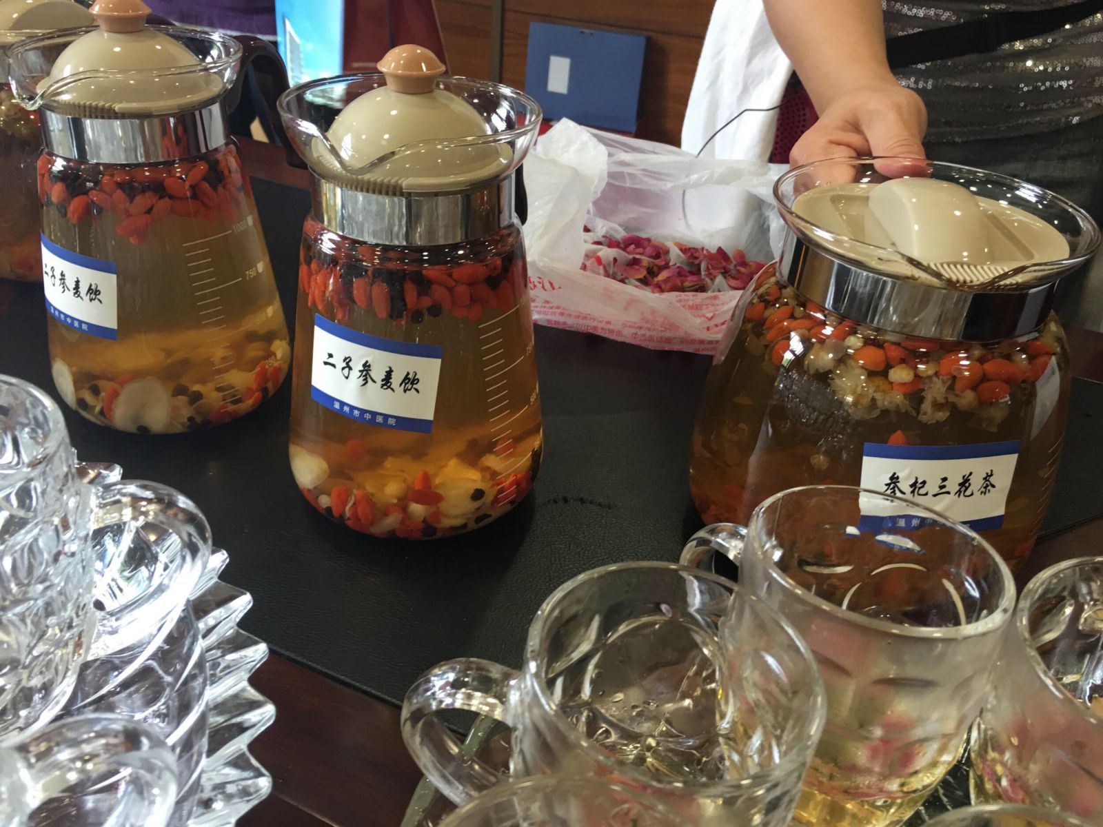 参观完中医药文化博物馆,工作人员已经为大家贴心地泡制了两款功效不同的夏日养心茶。一款叫做“二子参麦饮”,另一款则叫“参杞三花茶”。我院药剂科副主任朱雪梅介绍,“二子参麦饮”内含枸杞子、五味子、麦冬和生晒参,喝起来味道酸甜,具有清凉退火、生津解渴、消除疲劳的功效,对经常熬夜和加班的人士非常适用。而“参杞三花茶”更适合女性朋友饮用,内含枸杞子、生晒参、梅花、玫瑰花和菊花。