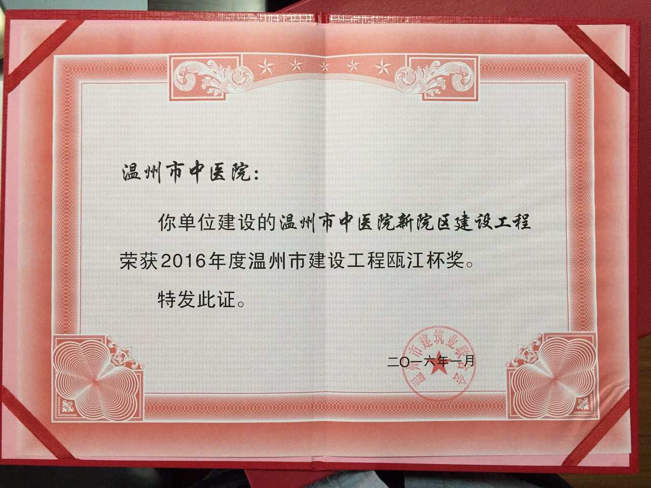 近日,2016年度温州市建筑工程“瓯江杯”奖评审结束,经过工程申报、基层推荐、协会初审、专家复查、评委评选、网上公示等一系列严格程序,评审组织最终确认了获奖名单,我院新院区建设工程名列其中,成绩喜人。
