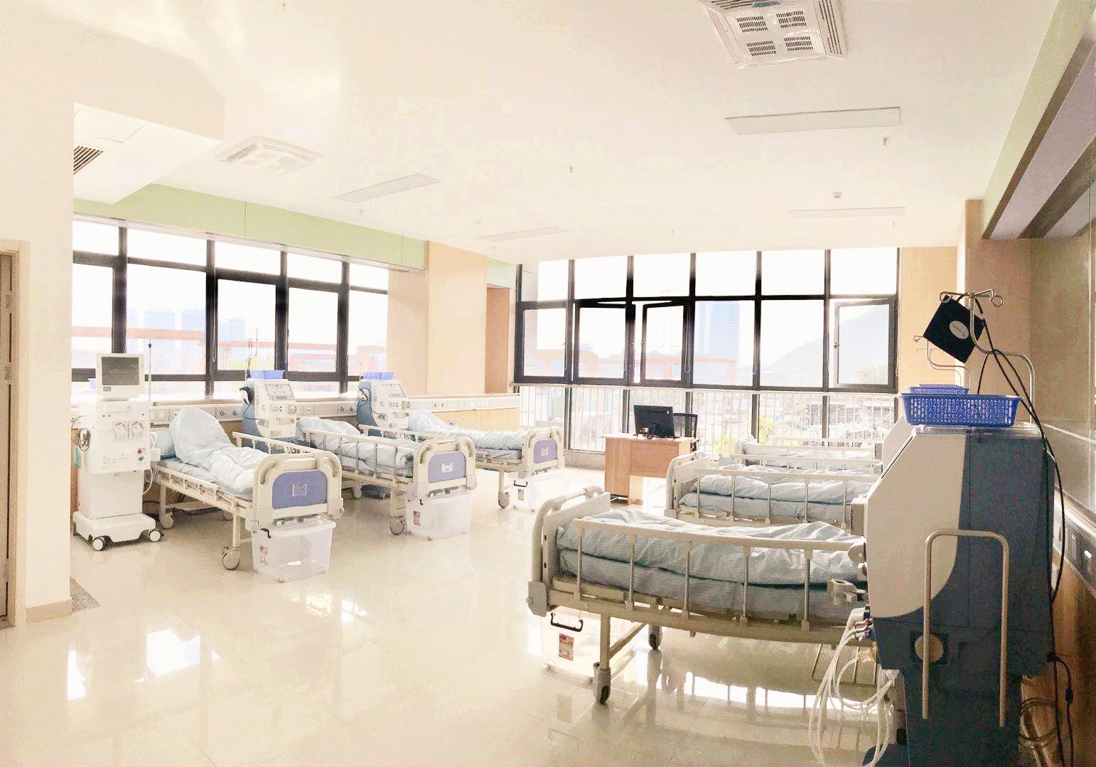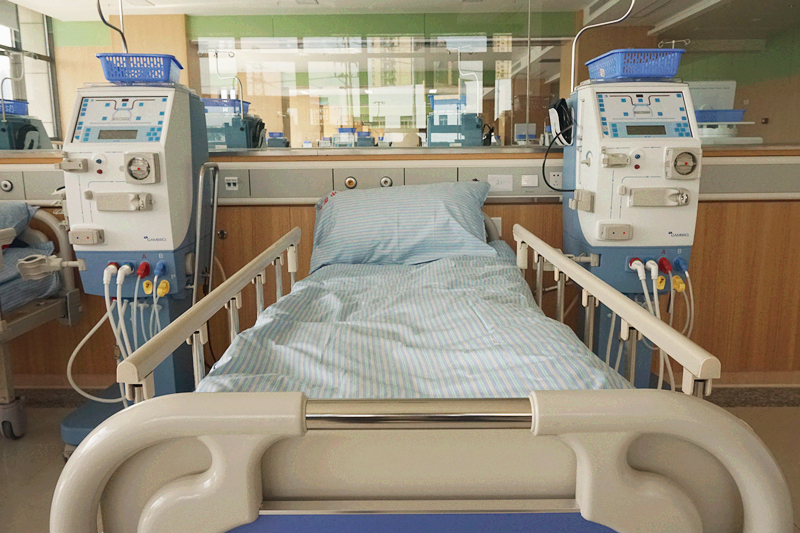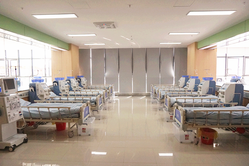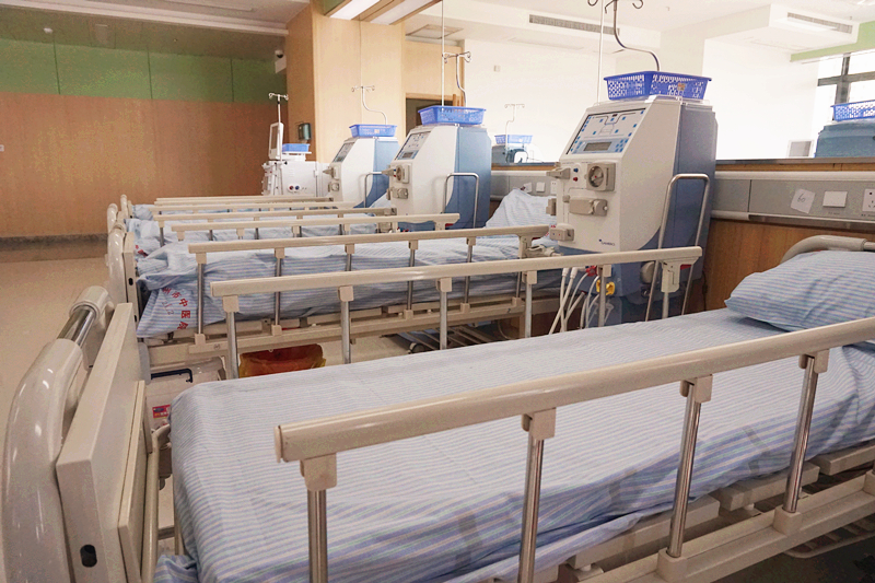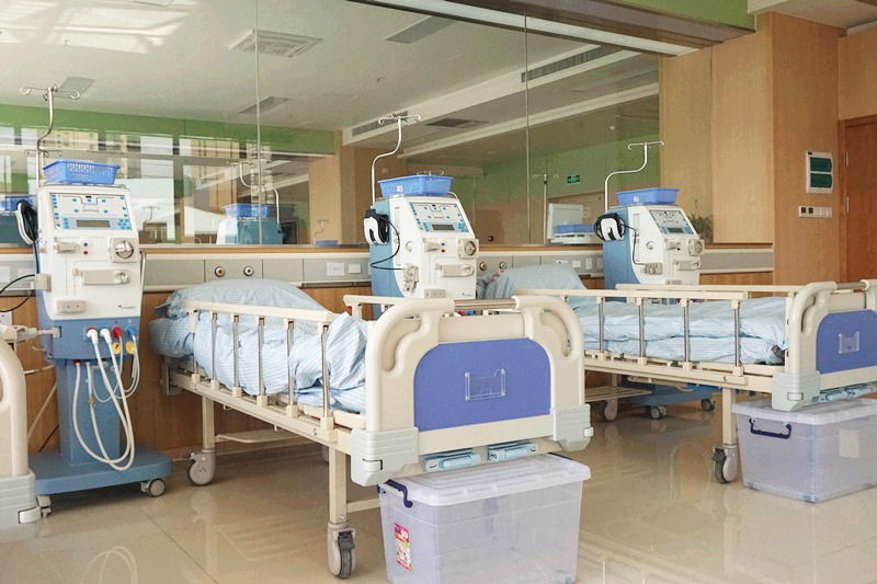 中医院六虹桥血液净化科现拥有德国贝朗、美国百特血液透析机共71台,年透析例次可达到4万余。拥有德国劳饵的双级反渗水处理机,透析用水达到国际超纯化透析标准,最大限度地减少了透析的副作用,能有效改善维持性血透患者的微炎症状态,从而充分保障患者透析品质,提高患者的生命质量及长期生存率。同时,本科透析治疗室安装等离子空气消毒机,可对空气质量进行实时消毒。并配备臭氧床单位消毒机,减少院内交叉感染的发生。