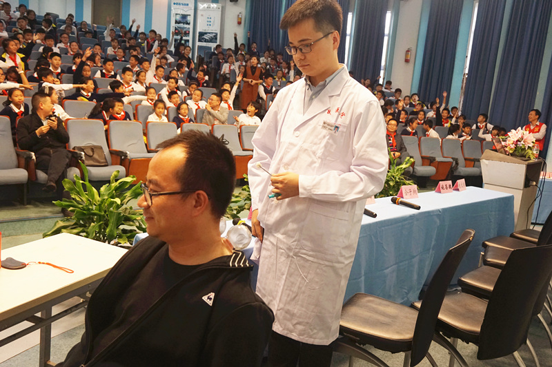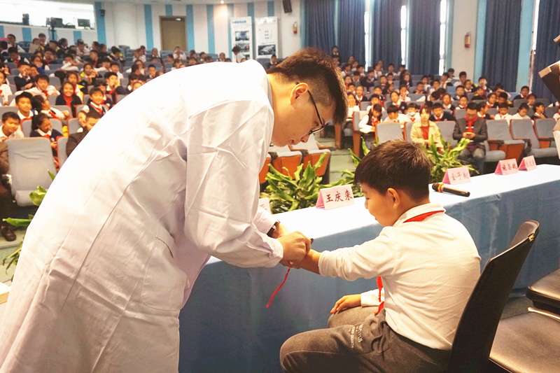 现场,王庆来院长寓教于乐,用通俗易懂的语言,通过常见食材与中药的联系,引导学生们发现身边的中医药常识,进一步认识中医药,了解中医药文化。王庆来院长还现场向学生们展示了日常穴位保健和中医刮痧、拔罐操作,学校老师和学生踊跃上台做示范,现场气氛热烈。