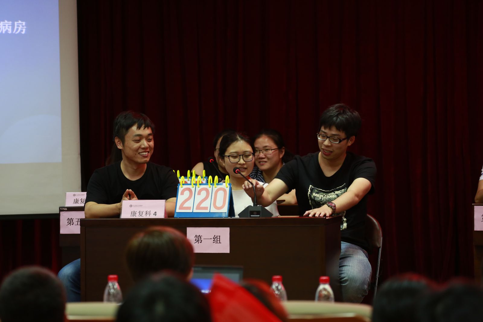 现场竞赛形式多样,设有必答题、抢答题、风险题以及现场观众互动环节。比赛现场精彩纷呈,氛围热烈,肿瘤科黄兆明主任、肾内科黄蔚霞主任和感染科朱小区主任亲自带领科室啦啦队拉横幅、喊口号,为各自队员加油助威。重症监护室的研究生黄定靠医师自信镇定的答题风格让大家印象深刻。肿瘤科年轻女医师汤方舒以“最佳抢手”为科室抢到诸多机会,最终以400分成绩遥遥领先。