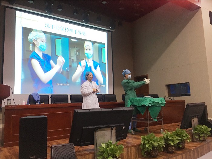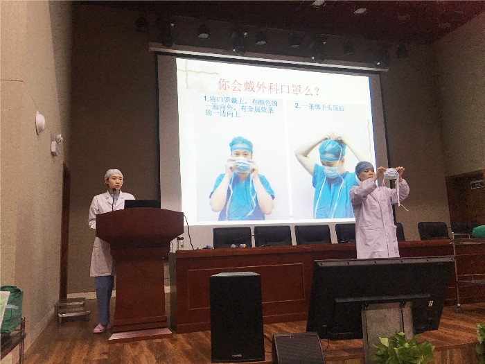 这次培训主要内容为手术室准入相关重要技术,如戴口罩帽子、外科洗手法、穿脱无菌手术衣、戴无菌手套等。首先由手术室苏怡丹护士授课《增强防控意识杜绝手术部位感染》,再由手术室詹欢乐护士长、朱芳静护士做现场演示,大家认真听讲,有的做笔记,有的拍照片。互动环节中多位医生自告奋勇,上台体验学习,获得大家的掌声。