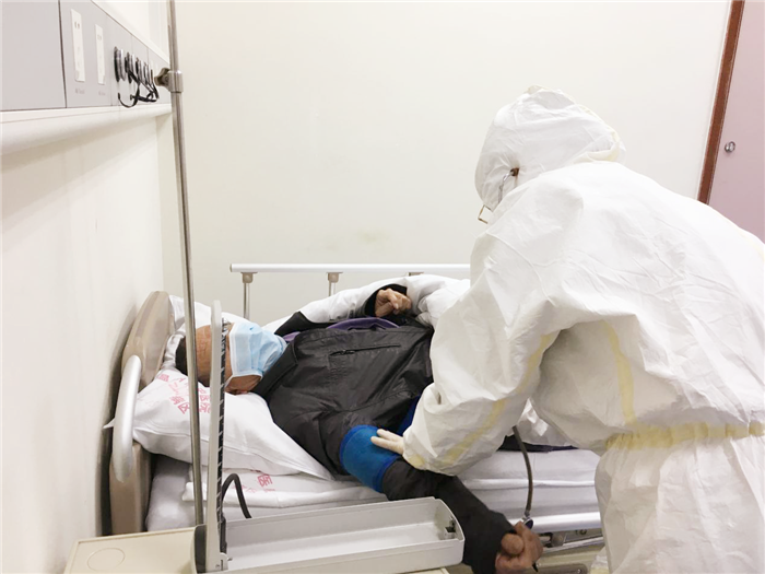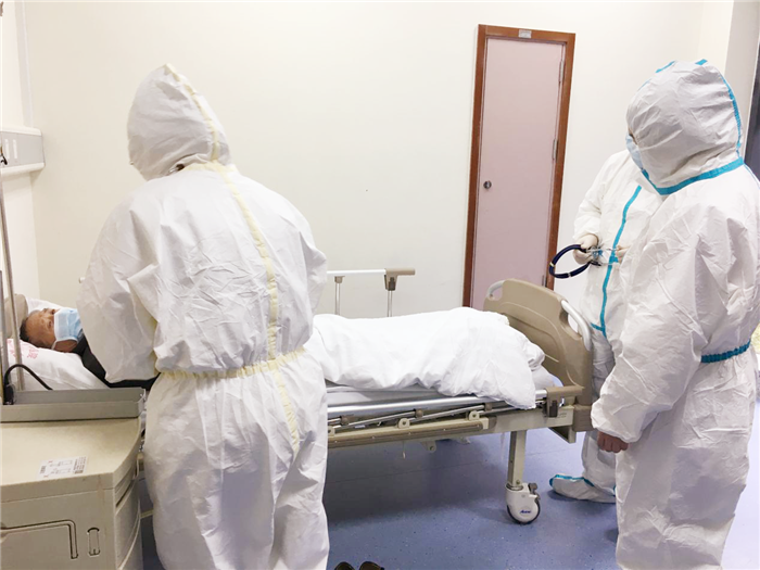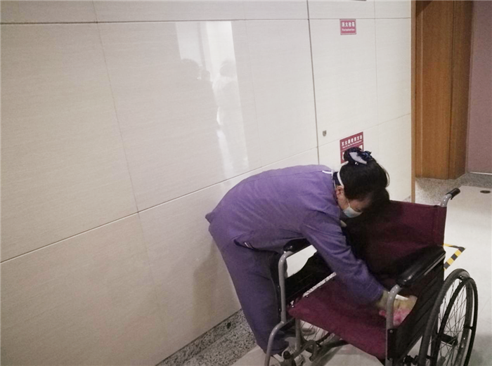 护工对轮椅进行消杀