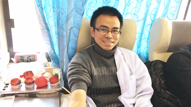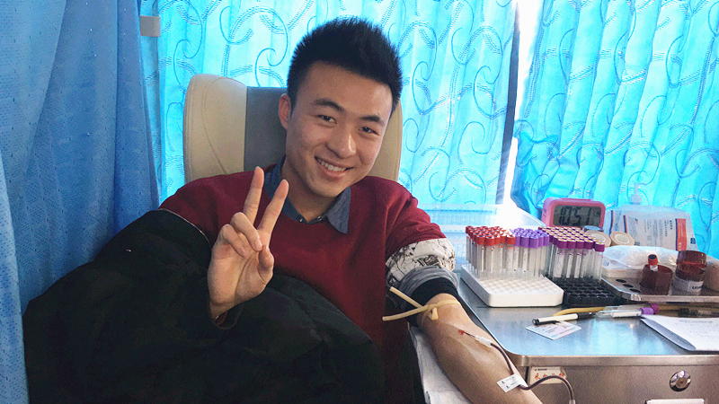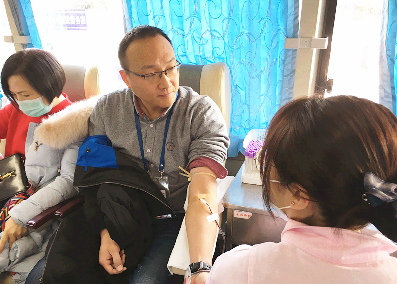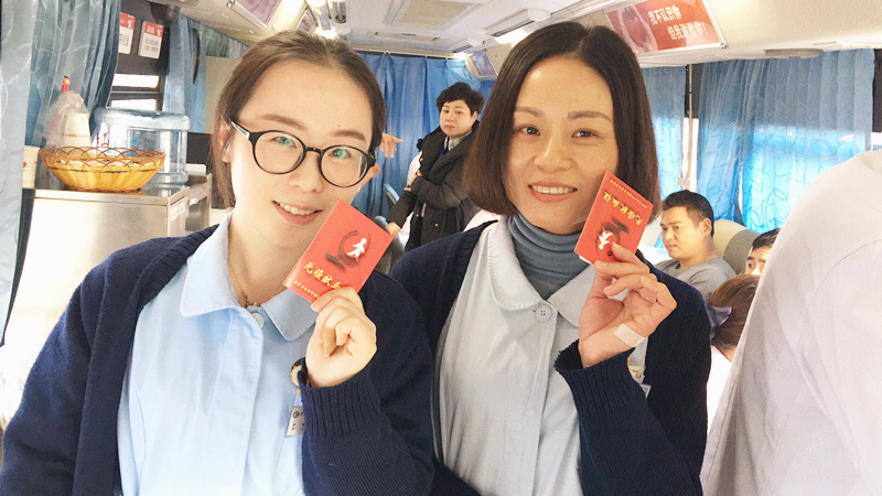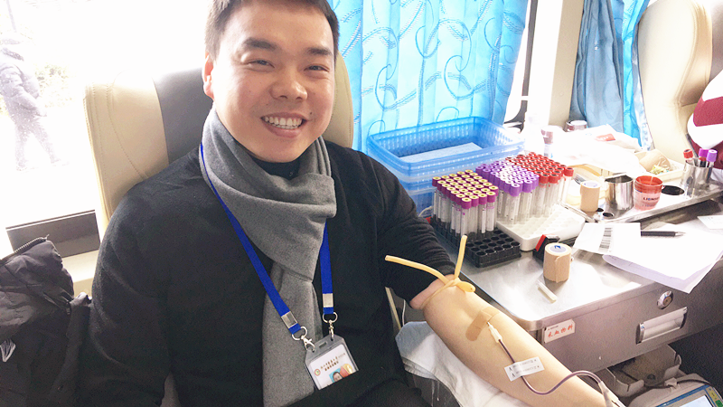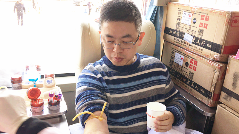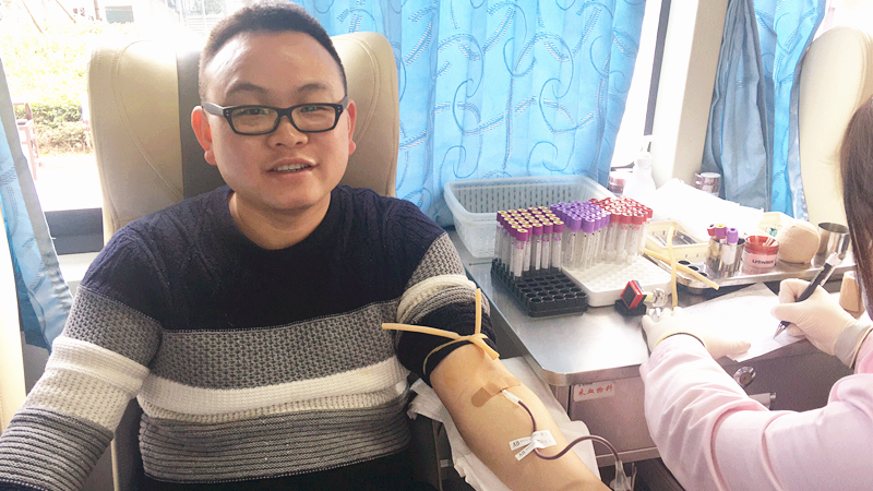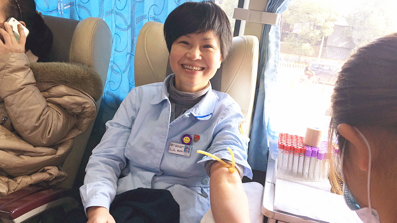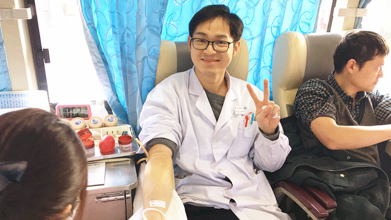 与此同时,献血车上又是一片其乐融融的景象。大家或是面不改色地望着鲜血汩汩流出,一派从容淡定;或是与周围的同事谈笑风生,颇有关二爷刮骨疗毒的豪迈;亦或是笑容灿烂,似是满足于自己能贡献一份鲜血,一份希望。当然,也有面露紧张,却依旧毅然决然地伸出手臂,这就像一场博弈,一边是几百毫升的鲜血,一边是重愈泰山的生命,选择自是不言而喻。这样的场景同样也发生在我院景山院区,大士门院区。值得一提的是,今年献血车首次驶入景山院区,无偿献血,享生命感动。