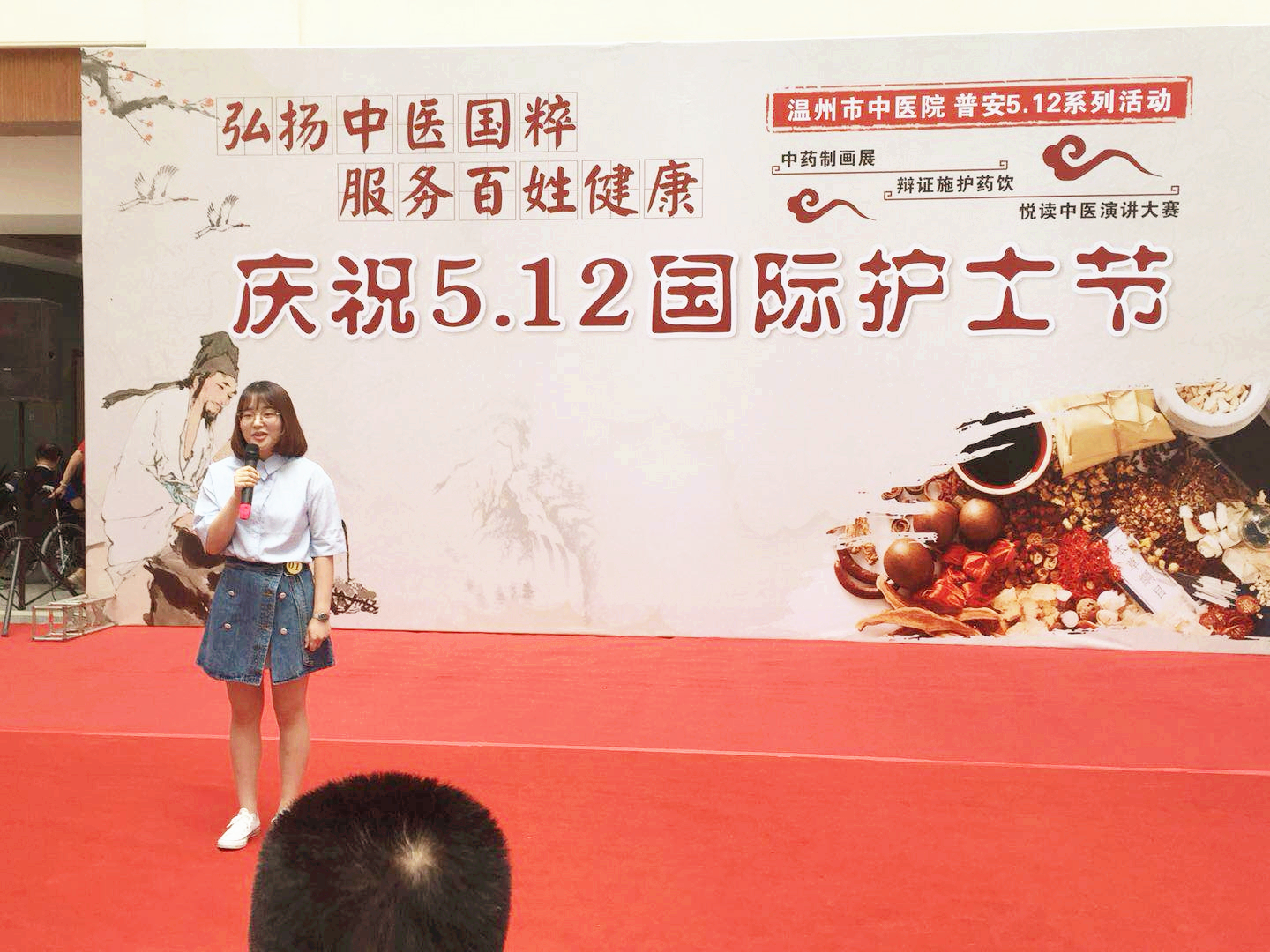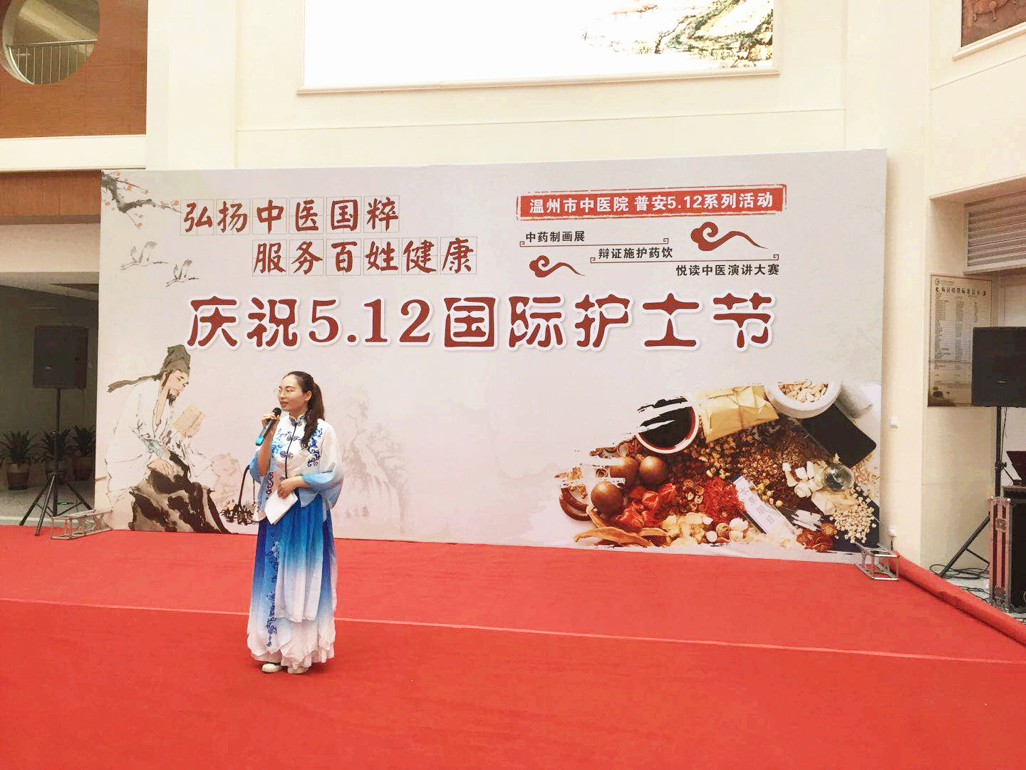 5月11日下午,我院举办普安月系列活动之“弘扬中医国粹,服务百姓健康”的主题活动,活动内容丰富多彩,其中悦读中医演讲大赛得到了各护理单元的踊跃参与。我院王庆来院长、施仲义副院长、麻瑞龙副院长、朱文宗副院长、赵永强副院长、缪心军副院长、曹文瑛总会计师、工会委员金瑞芬主任、中药房朱雪梅主任、孙乐(都市报记者)担任演讲大赛评委。