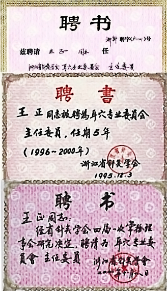 在36年的耳穴临床、教学、科研工作中,王教授参与“国家耳穴标准方案”和“国际耳穴标准方案”的制定工作,发表论文40余篇,出版四部专著和一本处方手册,荣获“全国耳穴医学研究杰出贡献奖”和“全国耳穴终身成就奖”等。曾任温州市中医药学会常务理事,针灸推拿分会副会长;浙江省针灸学会常务理事;耳穴专业委员会主任委员三届15年;全国耳穴诊治专业委员会常委,中国耳穴临床研究组组长;香港国际医学科学研究院客座教授,香港《亚洲医药》杂志高级医学顾问,东南亚地区中医美容专家委员会副主任委员,美国中医针灸医师联合总会理事等职。
