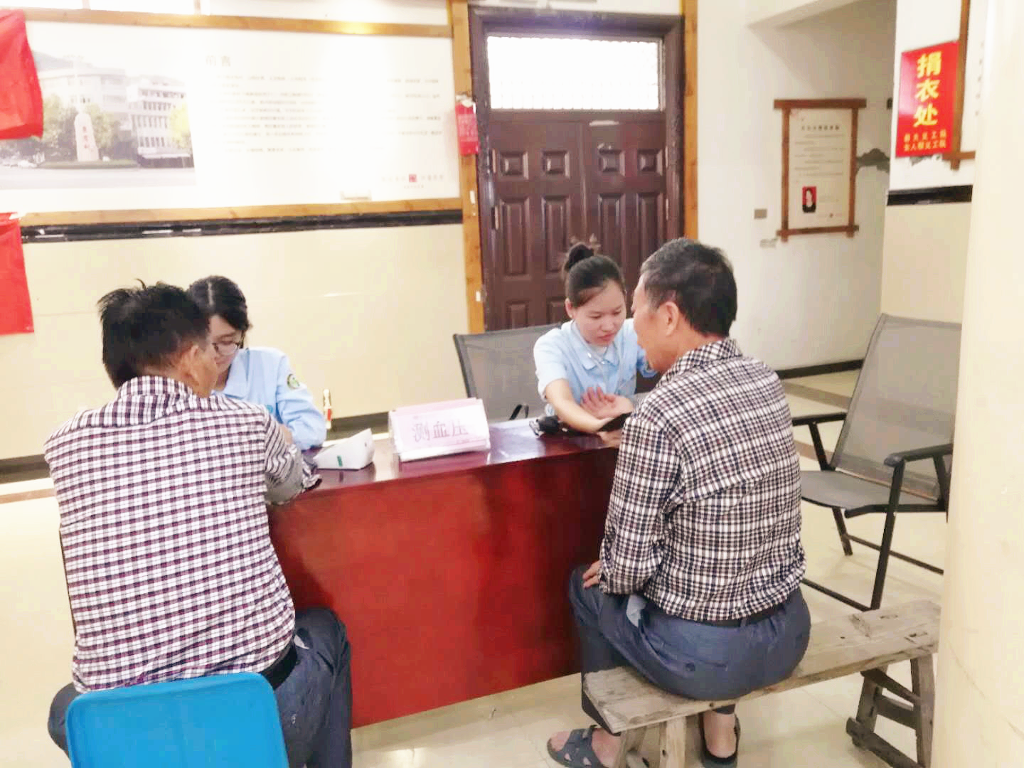 (护士为当地居民进行血压、血糖、血脂的检测)