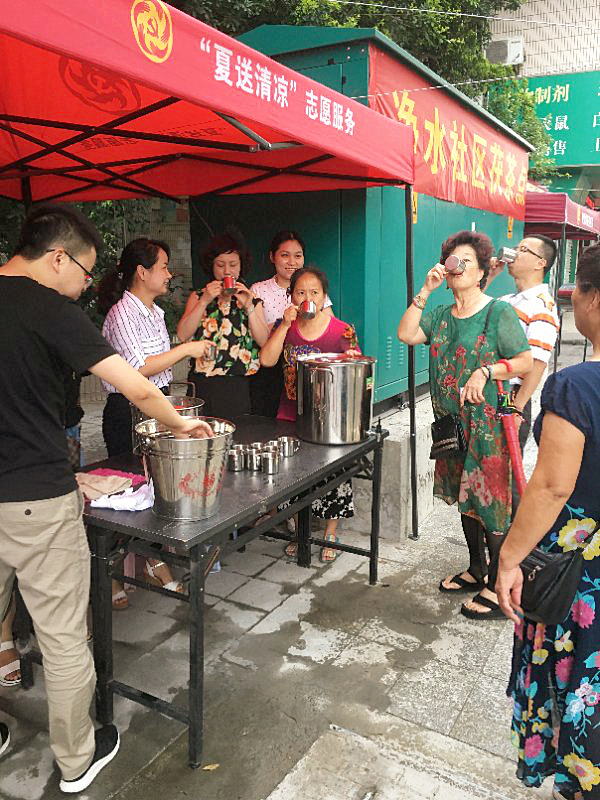 炎炎夏日,伏茶不仅能散热降温,生津止渴,更有预防胃肠消化疾病的功效。党员们不仅赠送了伏茶药材给净水社区,还在社区银龄之家门口设立了临时伏茶点,免费为居民提供伏茶。