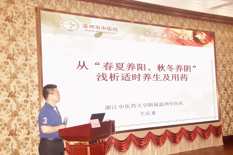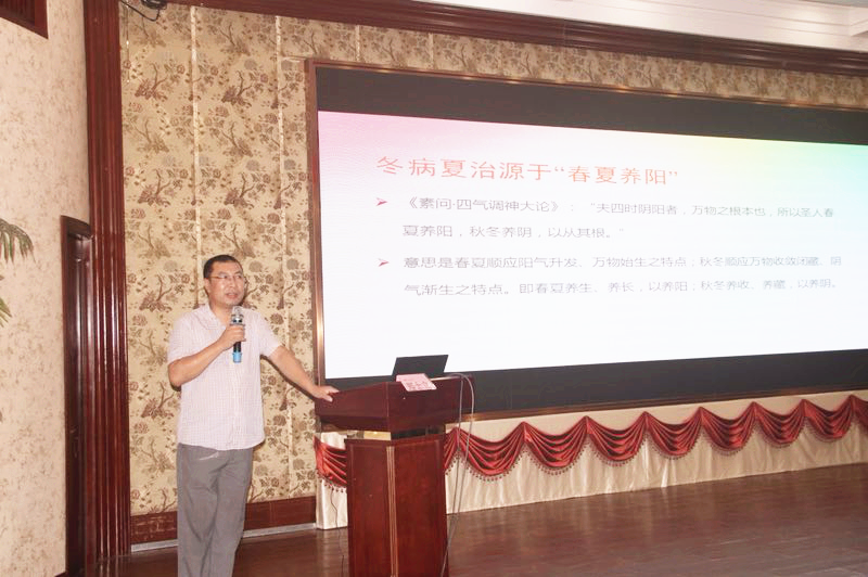 我院王庆来院长做了“从春夏养阳、秋冬养阴浅析适时养生及用药”的精彩演讲,图文并茂、深入浅出的讲解了历代医家对养生名言“春夏养阳、秋冬养阴”的观点及认识,并提出了自己对千古养生观点的看法,认为:“春夏养阳 、秋冬养阴”实质上强调了“天人合一”、“天人相应”的顺势养生原则,强调了养生在于顺应自然之道, 需要适时调整生活方式以保持与大环境气机变动的协调一致;“春夏养阳 、秋冬养阴”实质在于固阳,对于当今“阳虚者十之八九”的现代人来说,显得尤为重要;他还详细地解释了“春夏养阳,秋冬养阴”对临床谴方用药的重要指导意义,并提出如何利用“春夏养阳,秋冬养阴”理论来指导中医适时养生。
