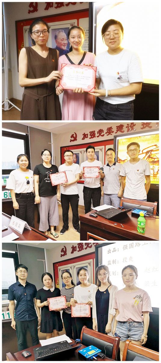 随后医技支部举办了以“弘扬红船精神,争当时代先锋”为主题的党建知识竞赛。党支部的3个党小组共派出5支队伍参加比赛,每队由3名党员组成。比赛设置了必答题和抢答题环节,包含文字题和视频题类型。支部青年委员陈孟权主持比赛,5支参赛队伍精神饱满的展开了激烈角逐,参赛选手个个胸有成竹,把必答题当成抢答题完成,各队都轻松过关,比分不分伯仲;抢答题环节比拼更加激烈,5支队伍选手们竞相抢答,最后在加试题中,李笑庆、周林双、郑温洁莹组成的先锋队技压群雄,取得第一名。比赛结束,党支部夏平易书记给各参赛选手颁奖。