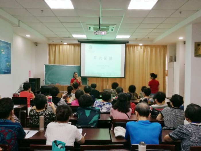 黄香妹主任护师根据老年朋友的特点,图文并茂,用通俗易懂的语言介绍了耳穴的分布及规律,常用耳穴的作用及查找方法,耳穴作用的机理,及学习耳穴操的注意事项。现场学员全神贯注地听课,还时不时地掏出手机拍照以便回家复习。在耳穴操操作环节,每位学员都积极参与,饶有兴趣地跟着学习。课后学员们仍然意犹未尽,不断提问,黄主任都耐心地一一予以答疑解惑。