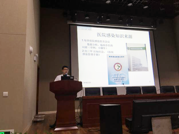 为提高交流,本次会议特安排优秀监控员代表分享经验。外科3汪海敏护士长从医护配合有效沟通、配合院感科工作、科室平时院感管理、院感记录本书写四个方面交流,内容实用;综合内科1的黄志有医师分享了自己感控知识来源渠道和导管血流感染的防控知识,他积极的学习态度和严谨的工作态度赢得了大家的掌声。