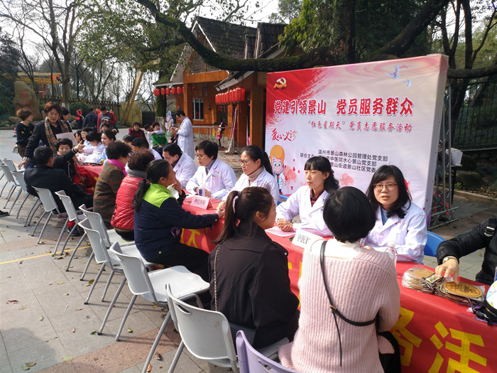 3月10日上午,我院水心景山党支部联合温州市景山森林公园管理处党支部、景山街道景山社区党委开展了以“党建引领景山,党员服务群众”为主题的党员义诊活动,用实际行动将健康送到百姓身边。