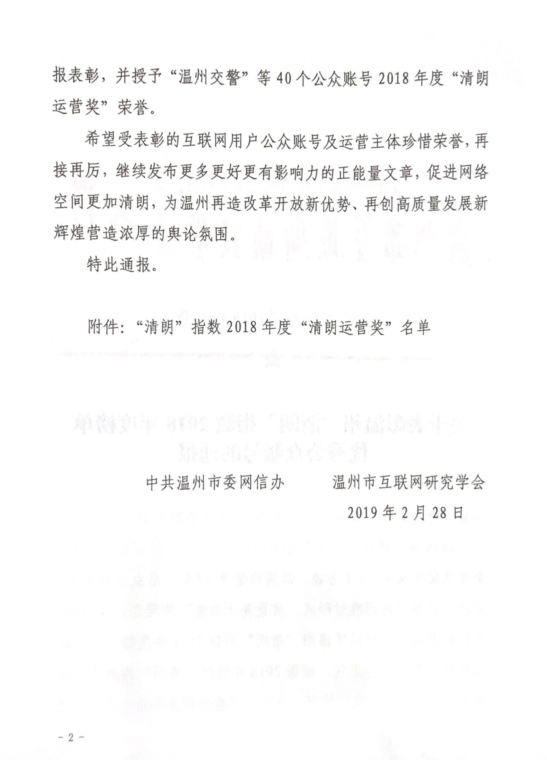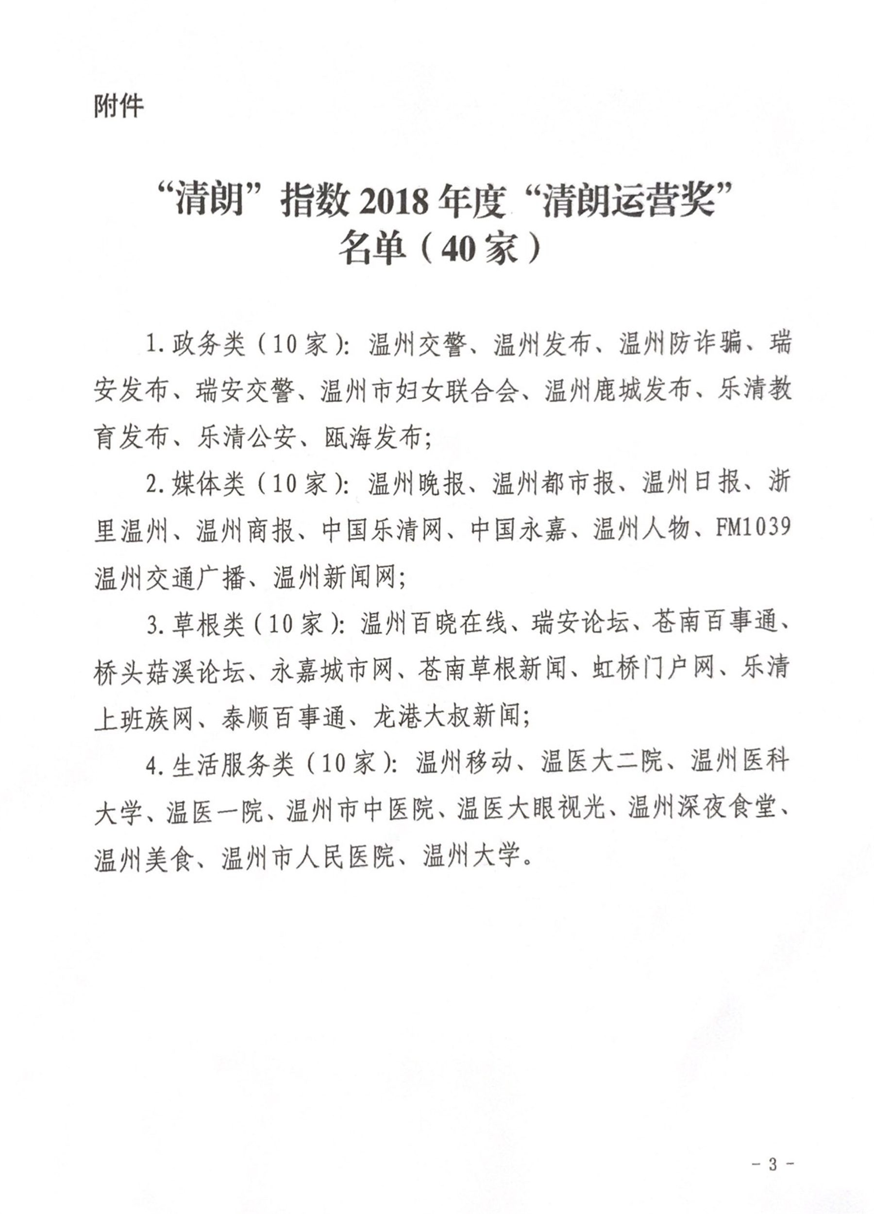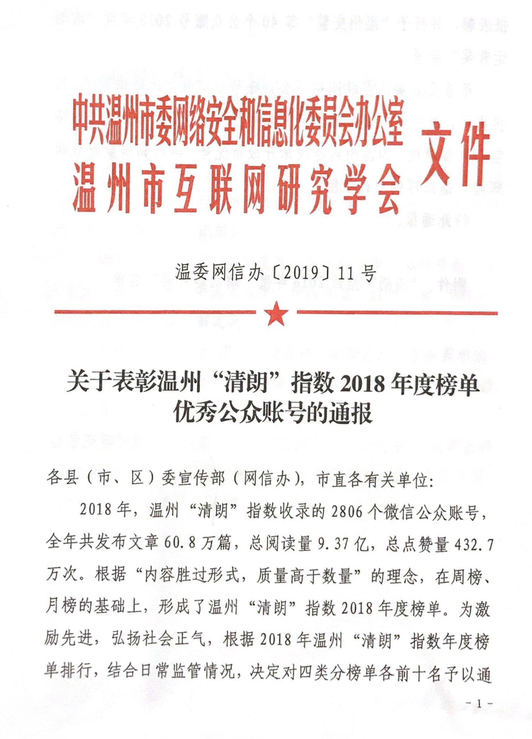 3月19日下午14:30,市委网信办在市人民大会堂202会议室举行温州“清朗”指数年度发布会,市委常委、宣传部长胡剑谨出席会议并做重要讲话。会议上表彰了温州“清朗”指数2018年度榜单优秀的微信运营平台。