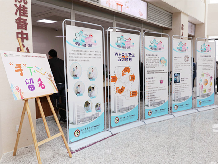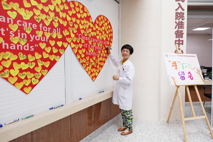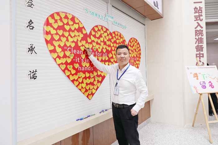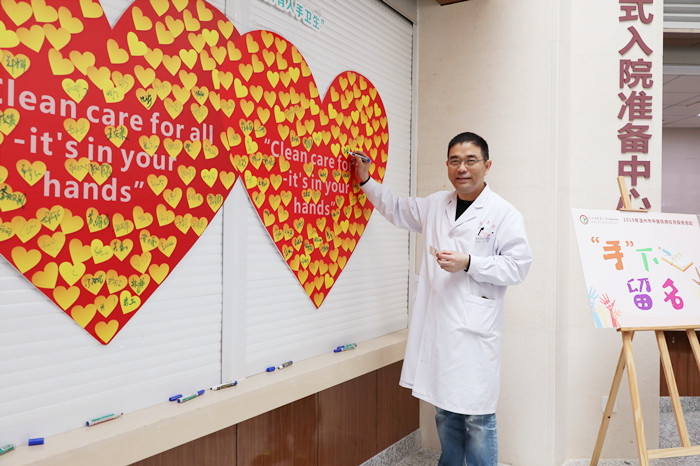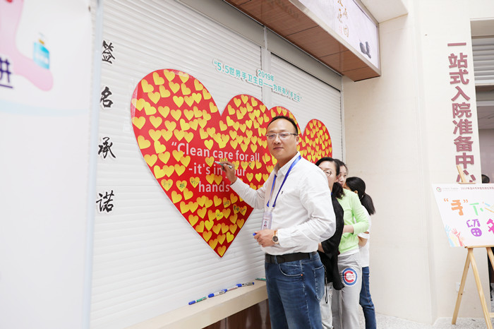 综合楼一楼大厅的手卫生宣传展板和LED大屏幕轮播的宣传海报营造了浓厚的宣教氛围。医院领导、中层干部及临床各科医务人员纷纷在手卫生日双红心主题宣传板上签名承诺。