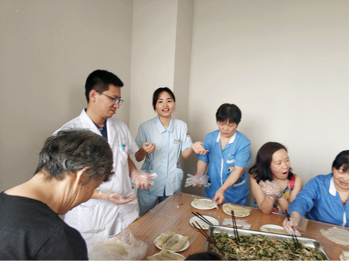 今日下午两点,综合内科2病区示教室内出现了热闹而又温馨的一幕:只见示教室内挤满了病人、病人家属及病区的医生和护士,大家其乐融融,用薄饼就着馅料包起了春卷。大家一起动手,不一会儿,就包好一大盘春卷。春卷饼薄料足,看起来相当美味,让人垂涎欲滴。包好后大家迫不及待地在欢声笑语中享用自己亲手制作的美食。在活动的最后,全体医护人员祝愿病区内患者早日康复。