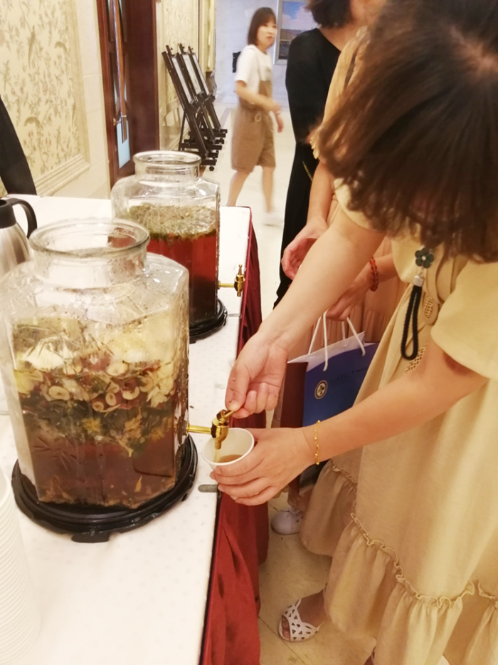 参会者在会务接待区品尝我院中药特色养生保健茶饮,感受中医药文化魅力。