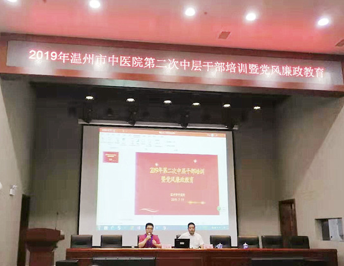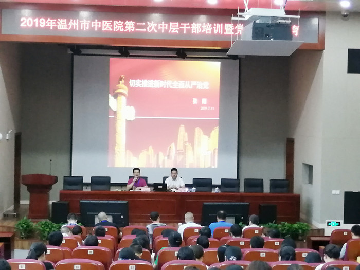 2019年7月19日下午,我院第二期中层干部暨党风廉政教育培训在综合楼八楼报告厅举行。此次培训特邀温州市纪委常委张雨,主讲“切实推进新时代全面从严治党”,院党委书记王庆来主持,全体领导班子、中层干部及各党支部委员参加了此次培训。