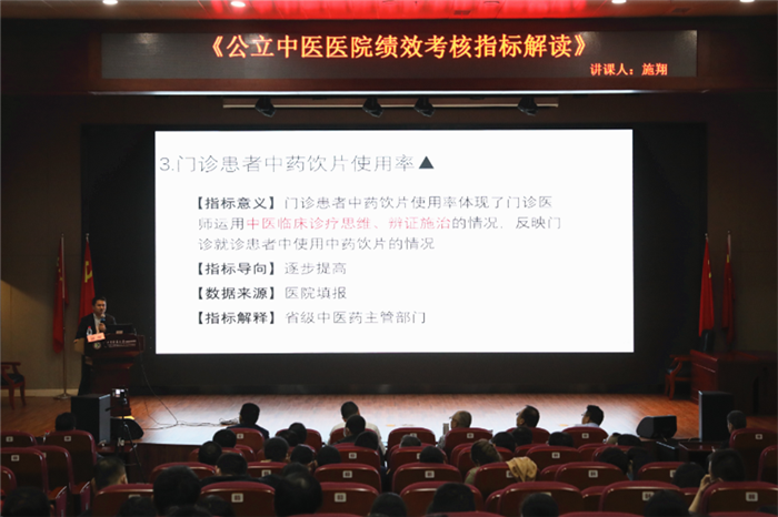 施翔副局长从政策依据和沿革、绩效考核指标以及浙江绩效考核情况三个方面对公立中医医院绩效考核展开讲解并提出几点思考及问题。施局长首先简单介绍了2015年至今的绩效考核相关文件,其次着重讲解中医医院绩效考核指标和中医特色及调整指标,结合病例、临床案例,从指标属性、指标定义、计算方法、指标说明等多个方面详细讲解了中医医院绩效考核的34条国家监测指标。在对浙江绩效考核情况及数据来源进行简单介绍后,施局长最后提出了八点思考及五个需要注意的问题,为全体中层干部在医院绩效考核方面提供了很好的思路和方向。