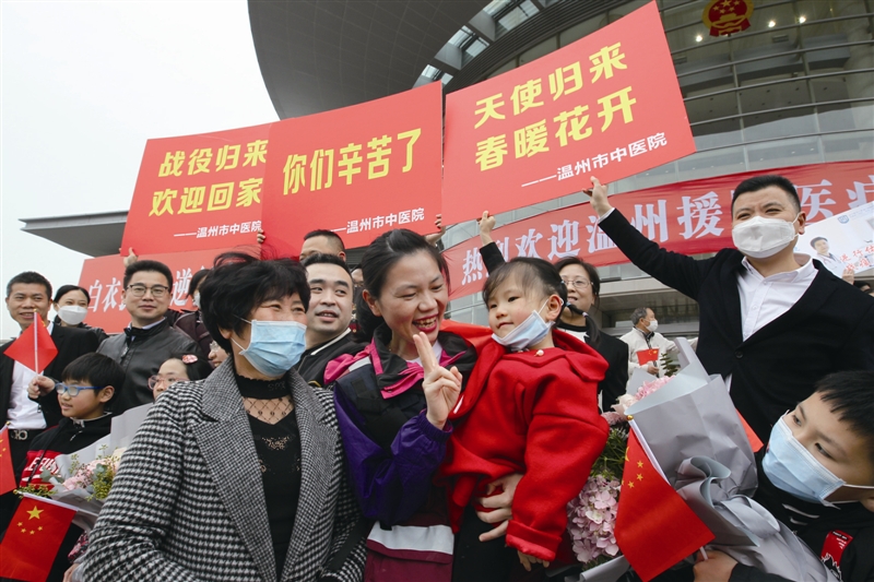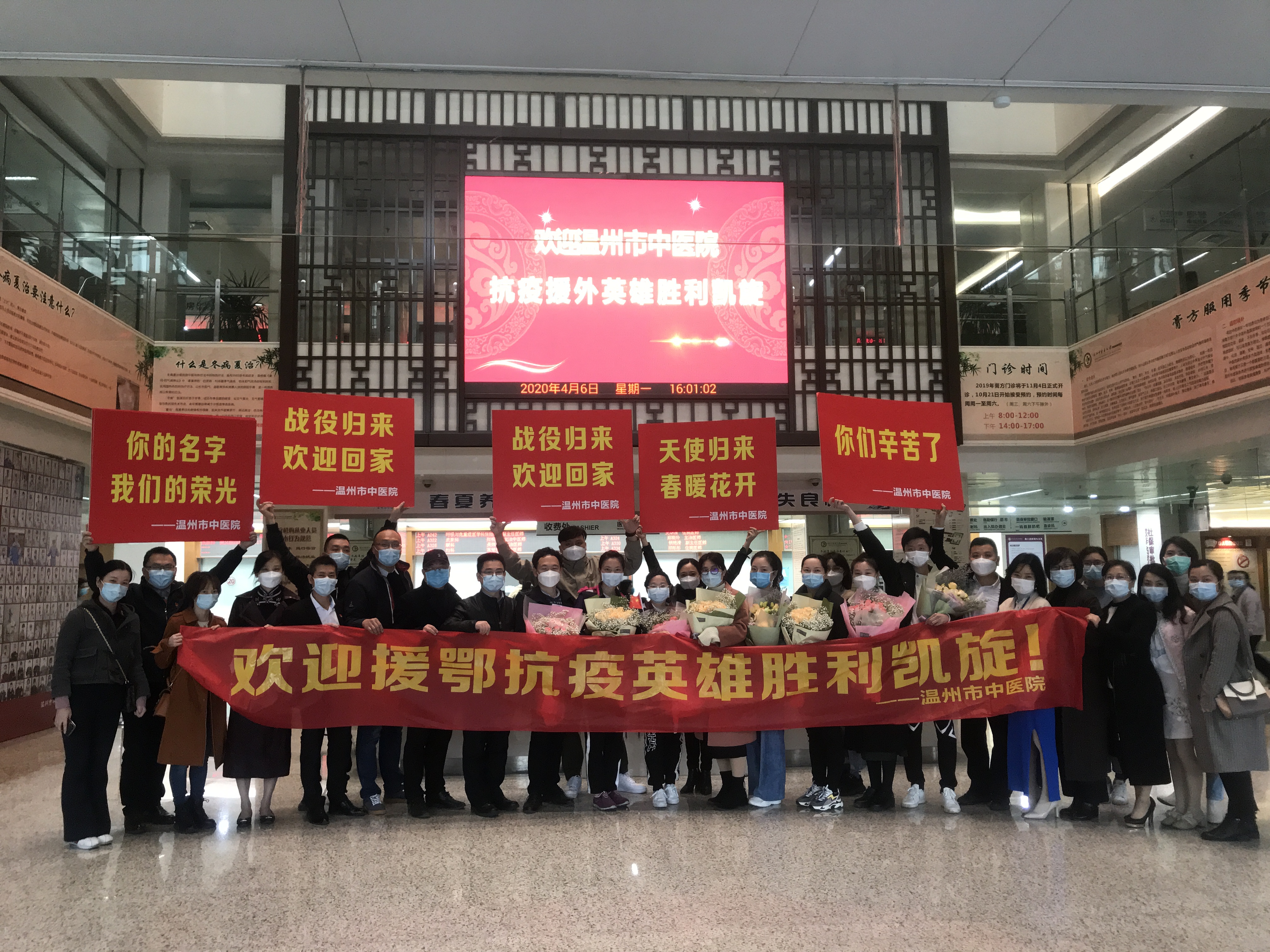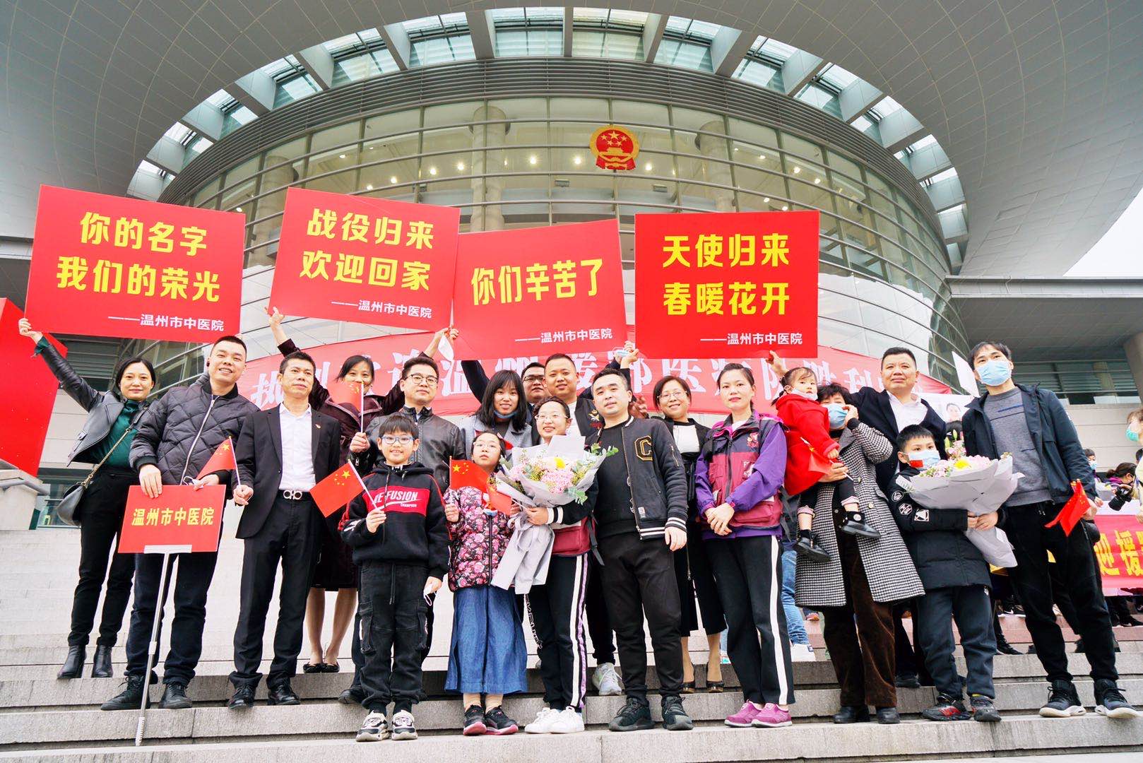 出征尚是春寒料峭,归来已是春暖花开。下午15点30分,搭乘着21名英雄的大巴车抵达温州市人民大会堂,市委书记陈伟俊、市长姚高员等市四套班子领导,及医院代表和家属代表,一起迎接援鄂英雄。