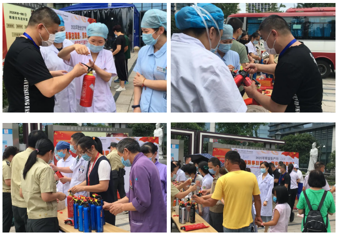 活动主要内容是由保卫科消防员向参与活动的人员一对一教学灭火器、消防水带、防毒面具、应急手报、逃生绳等消防器材的使用方法,为医院职工及来往院区的广大群众提出的安全问题进行答疑解惑,针对灭火器不会使用的人员开展实操演练,并对参与人员赠送便携式灭火器,透过一系列知识的宣传,受到了广大群众的一致好评。