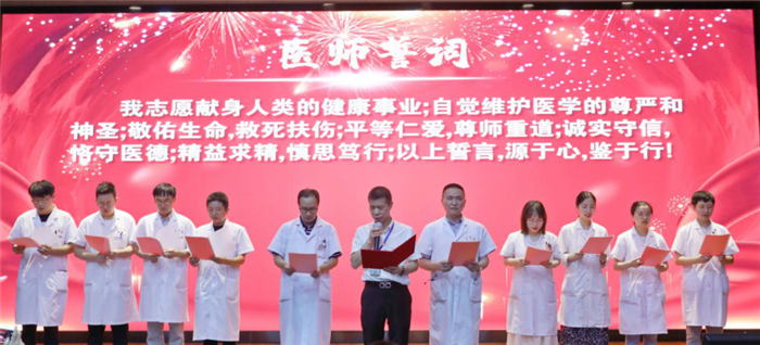 随后,医师代表们一起庄严宣誓,由副院长缪心军领读誓词,庄严的誓词,字字千钧,铿锵豪迈。缪心军副院长号召医务工作者献身医学,热爱祖国,忠于人民,恪守医德,以精湛的医术、良好的态度为患者提供更加优质高效的医疗服务,为打造“健康温州”添砖加瓦,为中国医疗卫生事业快速发展贡献自己的力量。