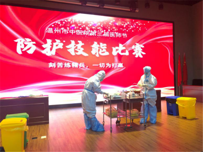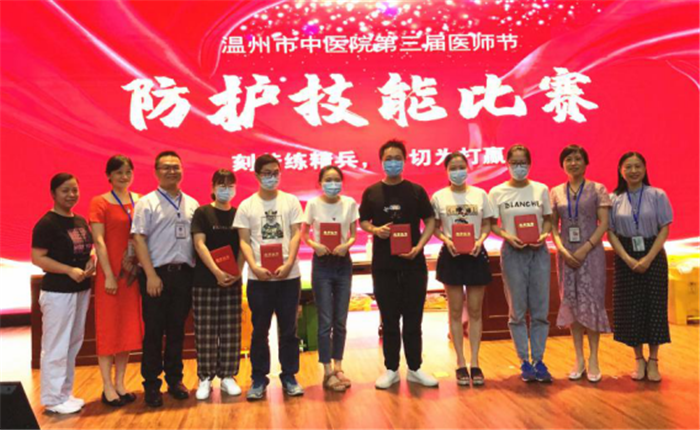 表彰大会后举行了防护技能比赛。为提高全院医务人员医院感染防控知识和技能水平,科学防范职业风险,提高医疗安全水平,医院精心组织,周密安排,以赛促学、以赛促练,掀起了“学技能、练硬功、比贡献、创一流”的热潮。最后,康复科4李优锋获一等奖,针灸科潘胜莲和康复3科陈赛亚获二等奖,康复1唐丹阳、中医妇科许文静和呼吸科黄约诺获三等奖的好成绩。