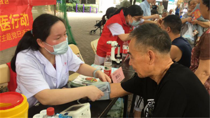 上午8点,医师和护士们在水心社区开展义诊活动。就诊及咨询的病种包含内科、肛肠科、骨科等常见疾病,并有免费送医送药活动及测血糖、测血压等辅助检查。