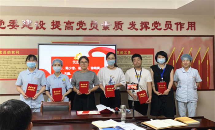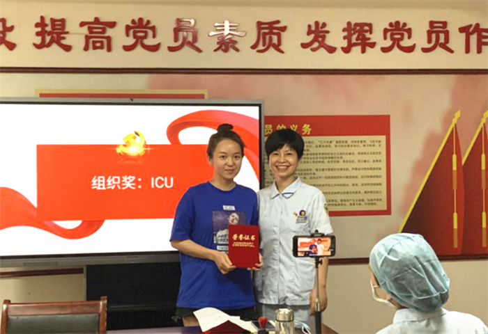 院长朱文宗同志及支部各支委对获奖党员进行颁奖。蔡晓丹同志获得一等奖,朱婧、刘三海同志获得二等奖,赵东瑞、王洁、谢敏同志获得三等奖,叶必宏等七名同志获得优胜奖,ICU党小组获得组织奖。