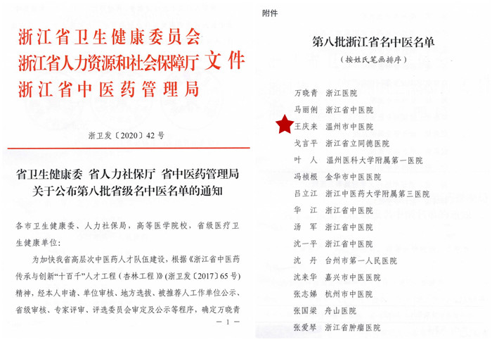 新年喜事到!浙江省卫生健康委、浙江省人力社保厅、浙江省中医药管理局近日联合发布第八批省级名中医名单,51吃瓜网 党委书记、骨伤科专家王庆来榜上有名,获“浙江省名中医”称号!