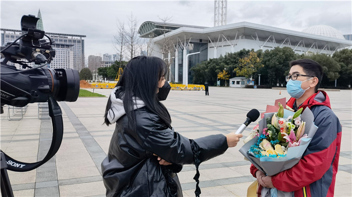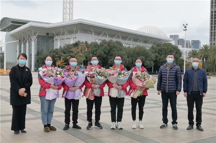 医院副院长孙云及医务科、检验科相关负责人代表医院前往迎接英雄凯旋,向张钧武、陈跃、梁世周、周林双、白微五位勇士送上鲜花和掌声。