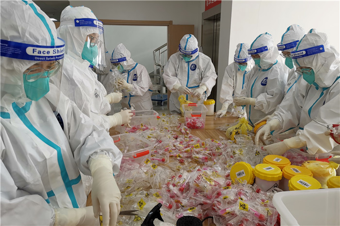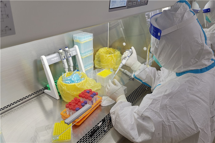 期间有人出现胸闷气促,有人出现头晕乏力,但他们仅仅穿着防护服抽空在角落里休息了几分钟便再次投入紧张的工作,他们始终坚守岗位,争取让每一批样本都在最短时间内完成检测。争分夺秒,与疫情比速度,与生命共赛跑。