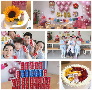 在血透室忙碌了一个早上后,护士长金晓敏召集大伙集合。推开示教室的大门,小伙伴们都被眼前的这一幕惊呆了:墙壁上贴着爱心气球,横幅上写着天使们护士节快乐,桌上精心准备着各种甜品、蛋糕,还有各种口味的水果,让护士姐妹们瞬间都嗨了起来,纷纷笑着说这是被甜品治愈的一天啊!