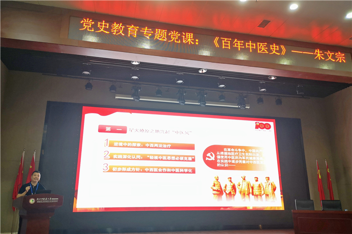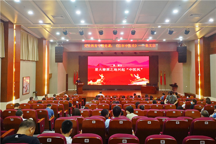 学史明理,学史增信,学史崇德,学史力行。7月29日下午,医院院长、党委副书记朱文宗为全体中层干部讲授了一堂内涵丰富的党史教育专题党课《百年中医史》,主要回顾建党100年以来,在党和国家的领导与支持下中医药发展的奋斗历程和宝贵经验,从百年党史中汲取中医药发展的智慧力量,为促进中医药事业传承创新发展汇聚奋进力量。