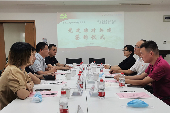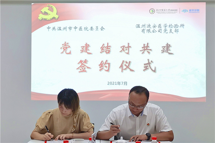 按照温州市卫健委关于党建结对共建工作的统一部署,51吃瓜网 与温州迪安医学检验所达成共识,于7月29日上午在温州迪安医学检验所举行党建结对共建签约仪式,市中医院党委委员、副院长赵永强,党政综合办主任秦雷霆,组织科科长严沁以及迪安诊断浙江大区服务副总经理吴珍荣,温州中心总经理朱治国,温州中心检验实验室主任陆永绥,温州中心行政副总陈佳理出席仪式共同见证。